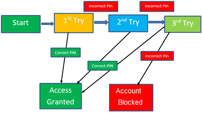 In the following example, if the user enters a valid password in any of the first three attempts the user will be able to log in successfully. If the user enters the invalid password in the first or second try, the user will be prompted to re-enter the password. When the user enters the password incorrectly for the third time, the action has been taken, and the account will be locked.